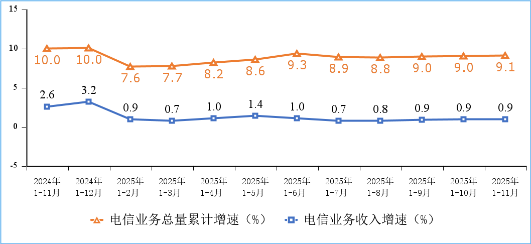 电信业务收入稳步增长,电信业务总量小幅回升。前11个月,电信业务收入累计完成16096亿元,同比增长0.9%。按照上年不变价计算的电信业务总量同比增长9.1%。